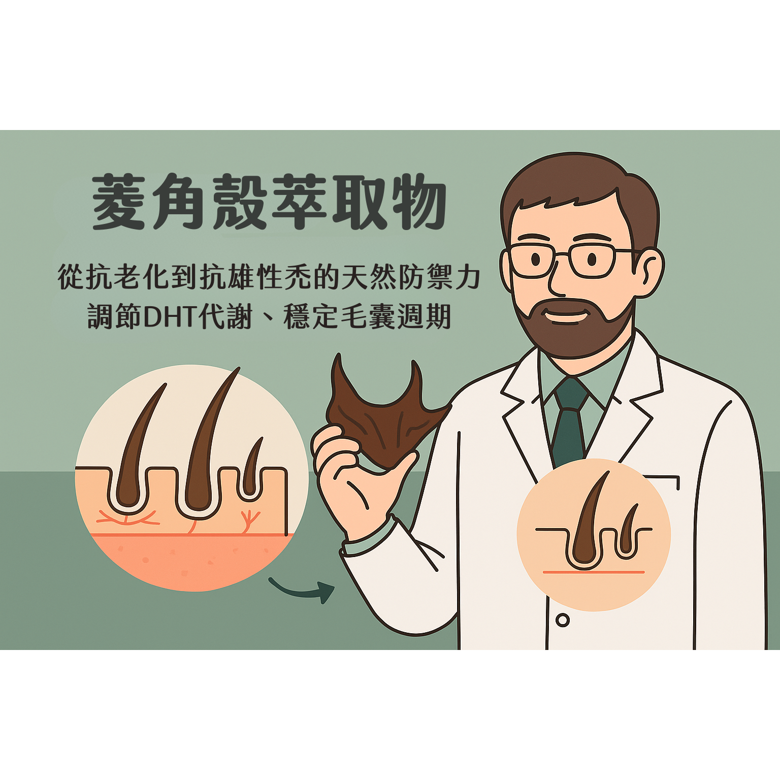 什麼?!菱角殼跟頭髮也有關係?!今天來探討髮晨錠很重要的成分—菱角殼萃取物 在臨床上,我們觀察到男性與女性頭皮老化與掉髮的成因不盡相同。 其中,雄性禿(AGA)最核心的機制是二氫睪固酮(DHT)對毛囊的慢性刺激,導致毛囊逐漸微小化。這種退化過程不僅與荷爾蒙相關,也與慢性發炎、氧化壓力與微循環不良密切相關。 在眾多天然植萃中,「菱角殼萃取物」的研究成果逐漸受到重視。它不只是抗氧化成分,更被視為能「調節毛囊環境、輔助抗DHT作用」的關鍵原料。 一、抗氧化 + 抗發炎,切斷雄性禿惡性循環菱角殼萃取物富含多酚類、鞣花酸與多種植物抗氧化素,能降低自由基引發的頭皮氧化壓力。臨床研究指出,這些活性分子能減少頭皮微發炎、降低IL-6與TNF-α等發炎因子,進而穩定毛囊環境。這對雄性禿患者特別重要:慢性發炎與氧化壓力會使毛囊對DHT更敏感,進一步加速退化。菱角殼萃取物能在這個關鍵環節「減敏化」毛囊,降低DHT對毛囊的破壞力。 二、調節DHT代謝、穩定毛囊週期部分研究指出,菱角殼萃取物中的多酚具有抑制5α-還原酶活性的作用,這是一種將睪固酮轉換為DHT的酵素。當5α-還原酶受到抑制,頭皮中DHT濃度下降,毛囊受到的退化刺激也隨之減少。這項機制使菱角殼萃取物成為天然、溫和、不具藥物副作用的抗雄性禿輔助成分之一。 三、促進頭皮微循環與營養供應氧化壓力降低後,血管內皮功能改善,頭皮微循環隨之提升。這意味著毛囊能獲得更多氧氣與營養,為新生髮提供更良好的生長環境。同時,鞣花酸與其他抗氧化分子還能保護毛囊幹細胞的活性,延長毛髮生長期(Anagen phase)。 四、延緩白髮與老化,維持整體頭皮年輕度雄性禿常伴隨頭皮提早老化、膠原支撐減弱與黑色素流失。菱角殼萃取物能抑制MMP-1酵素活性、維持膠原結構,並保護黑色素細胞免於氧化損傷。長期使用可達到防禿、防白、抗老的多重功效。 五、臨床應用與營養補充方向若將菱角殼萃取物與其他輔助成分(如鋅、鋸棕櫚、胺基酸群)搭配,能從「抗DHT → 抗氧化 → 促循環 → 活化毛囊」四個層面形成完整的防禿策略。這也是許多臨床營養調理產品(如髮晨錠、髮夜錠)採用分時配方設計的原因。 菱角殼萃取物不僅是一種抗氧化成分,更是一項針對雄性禿的天然防護素材。它能溫和地調節頭皮環境、降低DHT影響、延緩毛囊退化,並為頭皮健康建立長期防禦基礎。