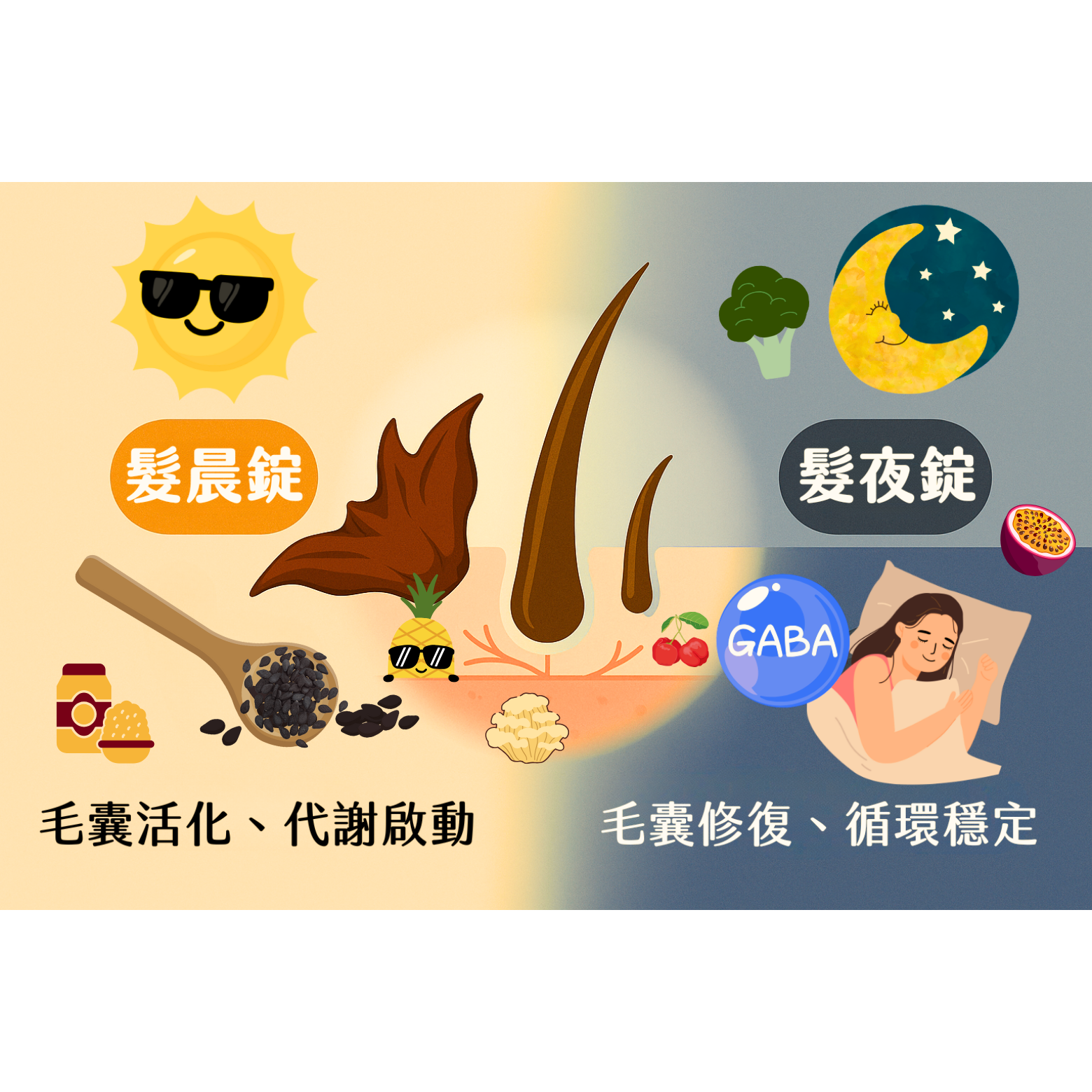 為何要「日夜分流」養髮?你知道毛囊也有晝夜節律嗎?• 白天以能量代謝、角蛋白合成與皮脂調控為主• 夜間則進入修復期,進行抗氧化、微循環調整與組織修護因此,以日夜不同機轉來支持毛囊,更貼近生理學。日夜雙配方的臨床思維MHMH吾髮吾天|髮晨錠—白天「代謝啟動」• 支持能量代謝與角蛋白生成、協助皮脂平衡、維持髮根活力。• 使用建議:早餐後 2 顆,連續使用可觀察白天出油與扁塌度是否改善。 MHMH吾髮吾天|髮夜錠—夜間「修復穩定」• 夜間抗氧化與舒緩、支持毛囊微循環與頭皮修護,協助提升睡眠品質相關的養髮條件。• 使用建議:睡前 2 顆,配合同時段就寢,讓修復窗口更完整。⸻10–12 週自我觀察計畫• 第0週基線:同角度拍頭皮與髮際線;記錄一週平均掉髮量、出油感與睡眠。• 第2–4週:多數人先感到「頭皮不那麼緊」、白天油膩與抓癢減少。• 第6–8週:落髮趨於穩定、扁塌改善;部分人於分線處見到短新生毛。• 第10–12週:整體豐盈度、髮徑手感與頭皮舒適度更穩定。(若出現急性或片狀脫髮、頭皮紅腫結痂等,請及早就醫評估。)⸻醫師給的三個日常處方1. 作息:固定就寢時段,避免熬夜;晚間減少藍光與咖啡因。2. 營養:每日蛋白質約 1–1.2 g/kg 體重,並留意鐵、鋅與B群的來源;精緻糖與酒精越少越好。3. 頭皮衛教:以溫和清潔為主,運動後立刻清洗;避免高溫吹整與緊繃綁髮。⸻給忙碌的你:簡單而持續• 早:髮晨錠2顆|晚:髮夜錠2顆• 連續 10–12 週,再與自己的基線照片比對。• 把頭髮,當作你「身體儀表板」的一部分來管理。 免責聲明:本文為健康管理與營養調理資訊分享,保健食品非藥品,無治療或預防疾病之效;孕哺乳、慢性病或用藥者,請先諮詢醫師或藥師