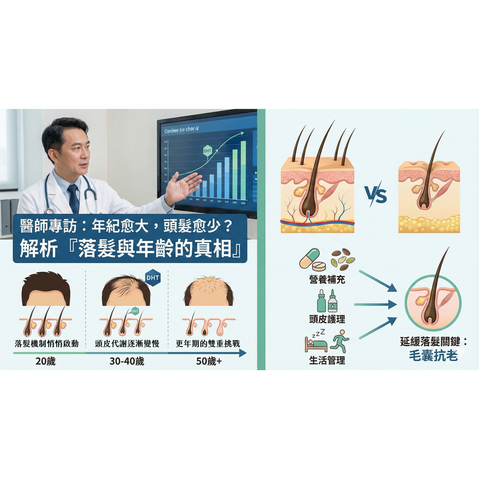 什麼?!年紀愈大,頭髮愈少?往下滑讓我們一起看醫師解析「落髮與年齡的真相」  「落髮」不是突如其來的問題,而是一個長達十年、甚至二十年的漸進過程。 許多患者在門診時常問我:「醫師,我才三十歲,怎麼頭髮就變這麼少?」 事實上,毛囊老化與年紀有著密不可分的關係,但影響速度的關鍵,卻往往是生活方式與身體狀態。 🧬 一、二十歲後:落髮機制就悄悄啟動醫師指出,從青春期結束後,體內的荷爾蒙平衡開始改變。 男性體內的睪固酮會轉化為二氫睪固酮(DHT),這種激素會使毛囊逐漸萎縮、髮絲變細、生命週期縮短。女性則因為壓力、飲食、避孕藥或生理週期變化,也可能出現暫時性掉髮。「許多男性在20歲後就出現額角後退、髮際線變高的現象;而女性則常在生產後或壓力高峰期,發現髮量明顯減少。」這些現象其實都是毛囊對荷爾蒙與壓力的反應。 🧠 二、三十到四十歲:頭皮代謝變慢,髮質開始改變到了三十歲之後,頭皮的新陳代謝速度開始下降,皮脂分泌與角質更新不再平衡。 一旦代謝變慢,毛囊口容易被油脂堵塞,導致毛髮營養吸收不良;相反地,頭皮若過乾,則容易產生微發炎,使毛囊提早進入休止期。「三十多歲的掉髮常不是單純的遺傳問題,而是生活型態累積出的『頭皮老化』結果。」此外,膠原蛋白與彈性纖維流失,讓頭皮逐漸鬆弛、支撐力下降,也會影響毛髮的生長方向與密度。 🧓 三、五十歲以後:荷爾蒙與營養的雙重挑戰更年期是另一個落髮關鍵期。 隨著雌激素與雄性激素的變化,毛囊進入休止期的比例明顯增加。 女性患者常描述「整體髮量變少、頭皮變得更明顯」,而男性則出現典型的雄性禿型態。「五十歲之後,身體吸收營養的效率下降,加上慢性疾病與藥物副作用,都可能讓毛囊的活力雪上加霜。」這時若沒有及時補充營養或改善循環,毛囊的再生能力會逐漸喪失。 💡 四、年齡影響髮量,但生活方式決定速度雖然年齡會改變荷爾蒙與代謝,但影響掉髮速度的往往是生活習慣。 醫師強調,以下幾個因素是造成「提早落髮」的主因:長期壓力、睡眠不足高油、高糖飲食長時間染燙與頭皮刺激缺乏鋅、鐵、維生素B群等營養素「簡單來說,頭皮就像土壤。當代謝差、營養不夠,再好的毛囊也長不出健康的髮絲。」 🌱 五、從「抗老」角度看頭髮保養現代人應將「抗老」觀念延伸到頭皮。 保持毛囊年輕、減少微發炎,就是延緩掉髮的關鍵。臨床建議包含以下內在營養補充: 可攝取富含鋅、黑芝麻萃取物、菱角殼萃取物、維生素B群與胺基酸等成分,有助於維持毛囊代謝與角蛋白生成。外在頭皮護理: 使用溫和的養髮洗髮精與精華液,促進循環、減少刺激。生活管理: 規律作息、充足睡眠、控制壓力與避免過度飲酒,對頭皮健康都有正面影響。 🩺 醫師結語頭髮的密度與生長力,確實會隨年齡逐漸下降, 但醫師強調:「掉髮的速度是可以被管理的。」 只要在不同年齡階段採取正確的保養策略, 即使過了四十、五十歲,也能讓頭皮維持年輕狀態,髮絲繼續健康生長。「年齡只是數字,毛囊的年齡,才是真正決定髮量的關鍵。」