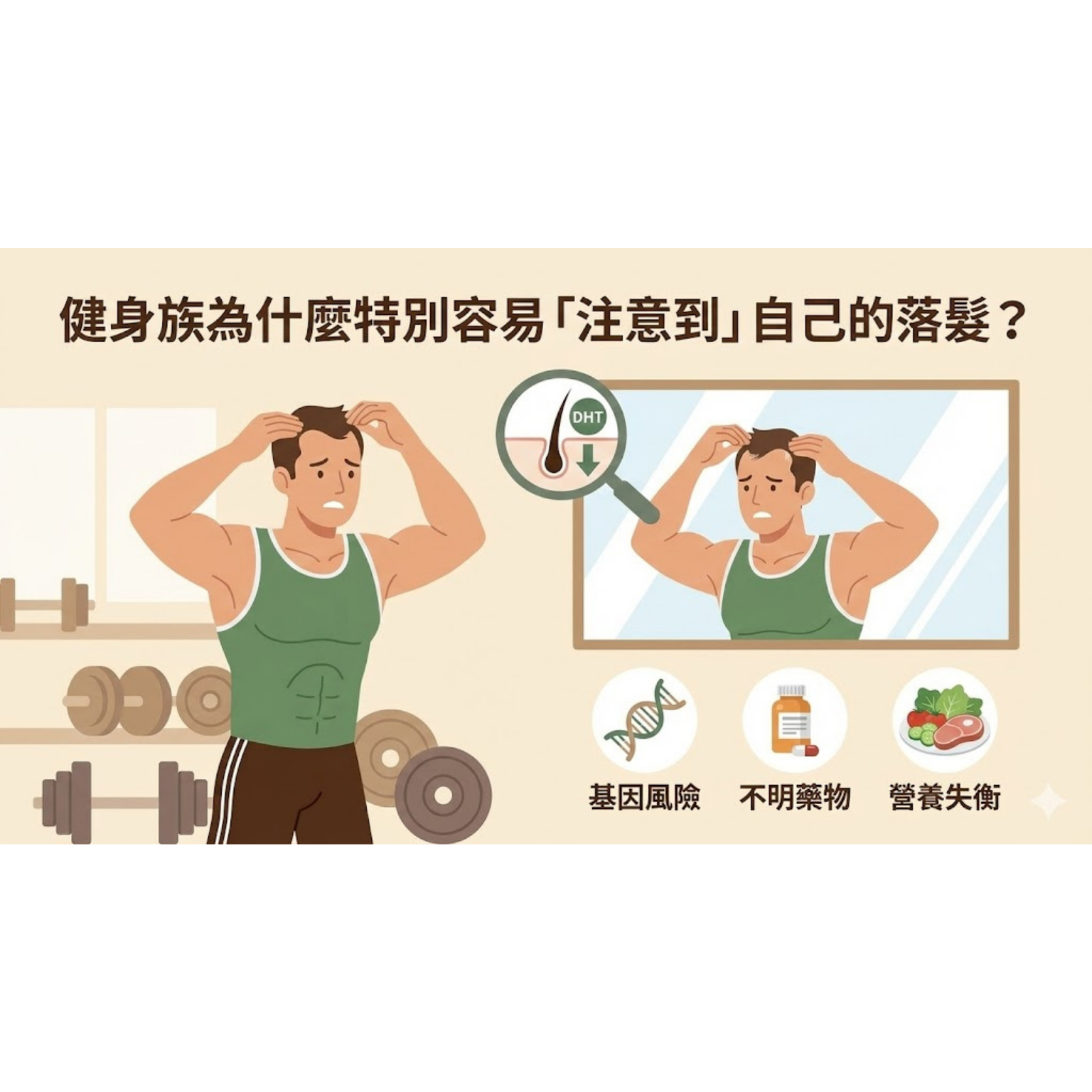 什麼?!健身越練,頭髮越少?先搞懂你是『真禿』還是『想太多』一、為什麼健身族特別容易「注意到」自己的落髮?不是你比較慘,而是你比較敏感。 1. 對外型高度在意 健身族最在乎線條、體脂、肌肉量,也更容易盯著鏡子看髮際線、頭頂。 一般人覺得「還好吧」,你可能已經覺得「是不是要禿了」。 2. 洗澡頻率高,落髮更顯眼 每天運動、每天洗頭,排水孔看到的頭髮「看起來」很多。 但其實多數人每天掉 50–100 根都是正常生理現象。 3. 健身黃金期=雄性禿「浮現期」 多數人開始認真健身的年紀,剛好落在 20–40 歲,這也是雄性禿最常開始出現的年齡段。 所以你看到的,不一定是「健身害的」,而是原本就會發生的事,剛好在你開始健身這段時間浮現。 二、真正會讓健身族「加速」落髮的幾個關鍵1. 基因+DHT:決定你是不是髮量「天生不吃香」 • 雄性禿的核心是「基因+荷爾蒙」: • 如果爸爸、外公、舅舅有人明顯雄性禿,你先天風險就比較高。 • 睪固酮轉換成 DHT(二氫睪固酮)後,會讓敏感的毛囊慢慢萎縮,髮絲越來越細。健身不會「創造」雄性禿,但如果你本來就有這個體質,任何會拉高雄性荷爾蒙或加重頭皮負擔的行為,都可能加速這個過程。 2. 類固醇與黑市增肌藥:對髮量最兇的一把火這是我們在健身族裡面,最常看到「加速型」落髮的主因。 • 為了快速長肌,有人會用: • 類固醇針劑 • 口服類固醇 • 其他來路不明的「補充品」或黑市藥物 • 這些東西會大幅提高睪固酮與 DHT 濃度, 若你本身就有雄性禿體質,就像在油箱裡倒汽油,髮際線、頭頂可能在幾個月內明顯後退。從品牌端的立場,我們非常直接地說: 如果你在乎頭髮,請遠離來路不明、未經醫師評估的類固醇與黑市藥物。 3. 極端飲食:過度低脂、暴力減脂、營養失衡健身飲食如果抓得太極端,也會讓頭髮先出問題。 • 長期極低脂 • 脂肪是荷爾蒙的重要原料,太低會影響荷爾蒙平衡與頭皮狀態。 • 暴瘦式減脂、長期熱量嚴重不足 • 身體會優先保護心臟、大腦等重要器官,頭髮被視為「非必要」,就會進入大量休止期而掉髮。 • 只顧蛋白質,不顧微量營養素 • 鐵、鋅、維生素 D、B 群、生物素等缺乏,都會讓髮質與生長週期變差。你可能肌肉線條漂亮、InBody 很好看,但頭髮正在默默替你付出代價。 4. 壓力、熬夜、過度訓練健身是身體的「良性壓力」, 但如果再疊加: • 長期高壓的工作環境 • 熬夜、睡眠時間不足 • 沒有安排足夠恢復日就容易出現「壓力型掉髮」: 全頭分散性變稀、抓一把就一堆,但不一定是典型 M 型或地中海。 三、健身族常問三大問題 四、健身族怎麼保護自己的髮量?五、我們想給健身族的一句話你為了身材投入那麼多時間, 頭髮其實也值得同樣等級的重視。 • 健身不會讓你變禿; • 真正會偷走你髮量的,是基因、荷爾蒙失衡、極端飲食、亂用藥與長期壓力。吾髮吾天專注在「可以長期維持的頭髮健康方案」: 從日常營養補給、頭皮保養,到必要時的醫療與專業療程評估, 我們希望陪你一起做到的是—身材練得好看,髮量也一起撐得住。 如果你已經在健身路上,卻開始擔心落髮, 歡迎把你的狀況(年齡、健身頻率、目前髮量變化)告訴我們我們會制定給您最適合的解決方法
